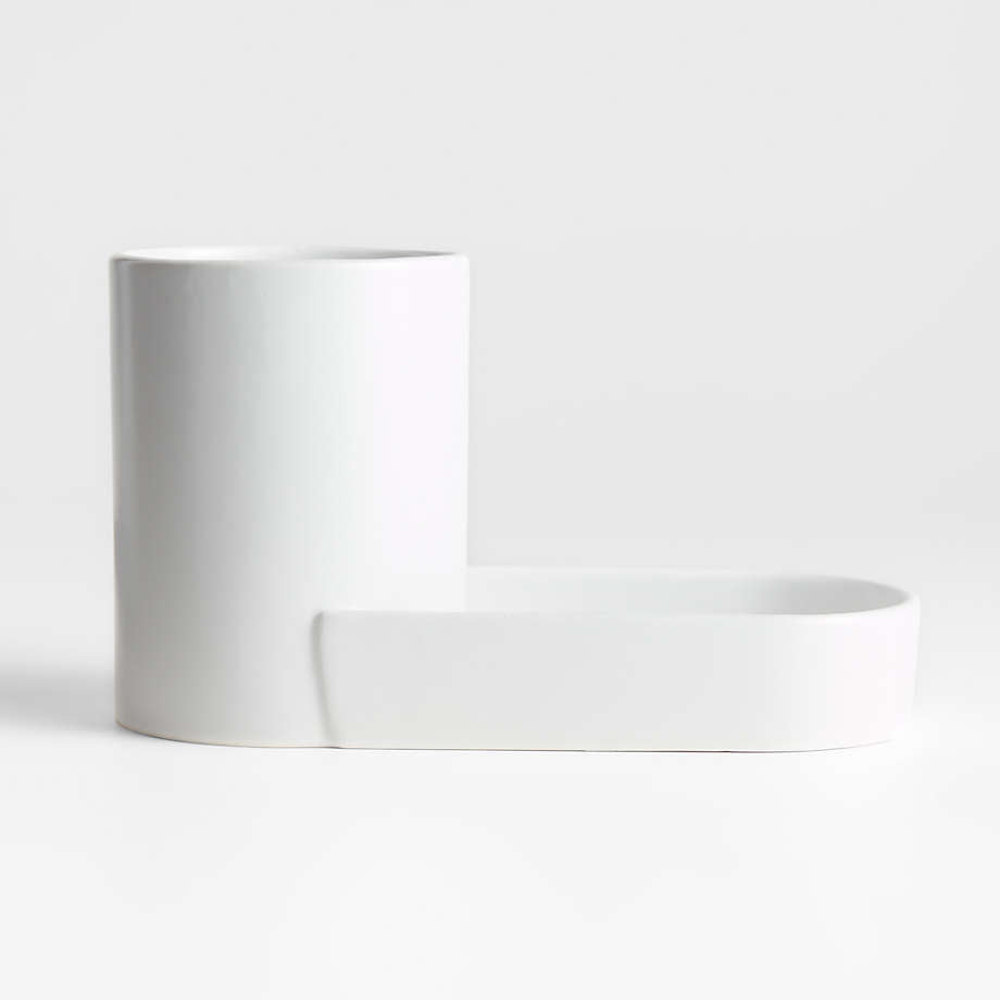 Corral your kitchen sponge and scrub brush in this modern and minimalist sink caddy. Glazed matte black, the ceramic sink caddy joins a cup for holding brushes or dish soap and an open ridged area for drying off sponges. A Crate & Barrel exclusive, the black sink caddy is part of our Chet collection designed to keep your kitchen counter clean, organized and looking its best.